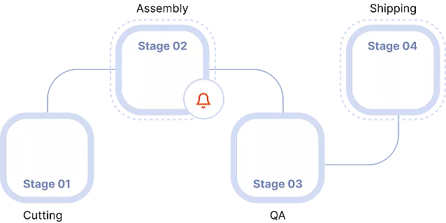 - Custom production stages (e.g. Cutting → Assembly → QA → Shipping)